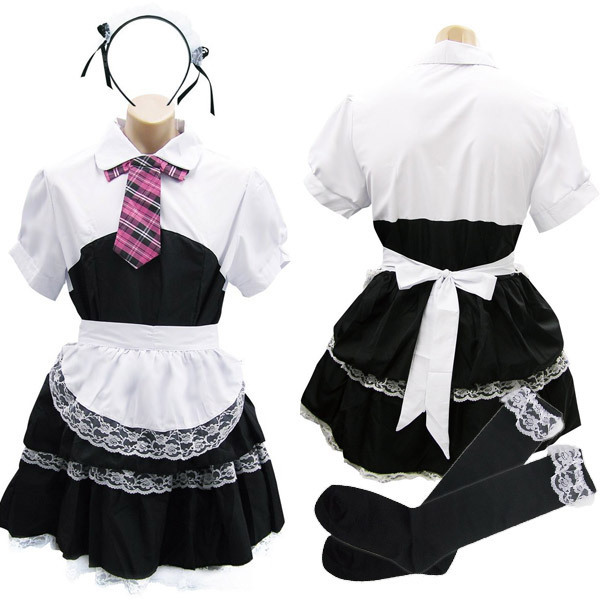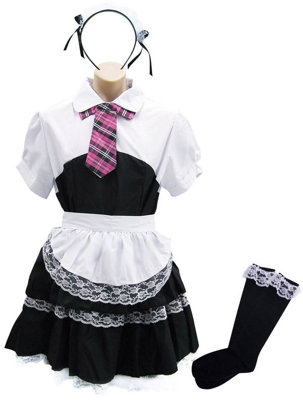 レース飾りがお洒落なシャツ一体型ワンピース、フリルエプロン、チェックのネクタイ、サイドリボン付きカチューシャ、黒ハイソックスの豪華5点セット!憧れのメイドさんになれちゃう、セクシーコスチュームです。
