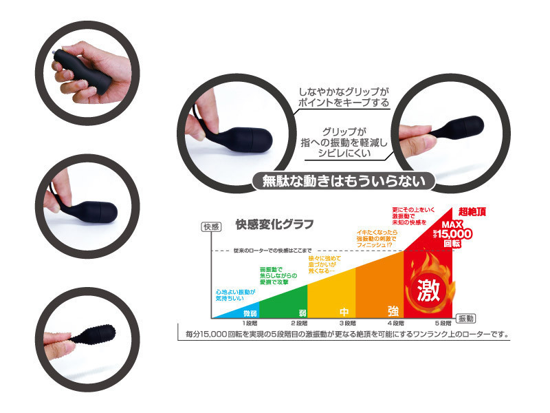 - 仕様パッケージ:17.5×8.5×3.5cm 本体:リモコン8.5×3.0cm 振動部6.8×2.0cm 単四電池×2 毎分15000回転が生み出す激しい絶頂感!最上級即逝きモード『激』搭載シングルローター。