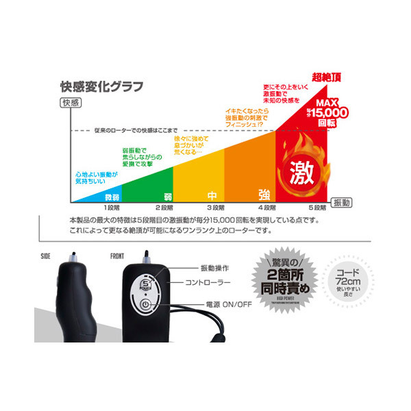 - 仕様パッケージ:17.5×8.5×3.5cm 本体:ローター部約7×2cm 単四電池×2本使用 二ヶ所同時責めで一気に昇天!MAX15000回転の超絶振動「激」モードを搭載したダブルローターのビブラル。