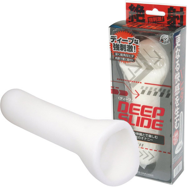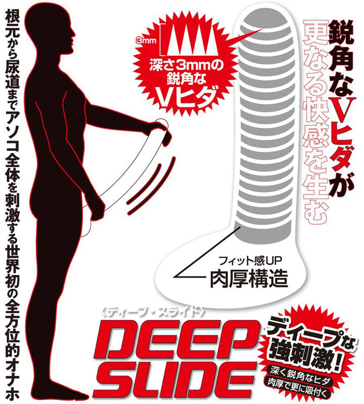 - 仕様非貫通型 パッケージ:26.5×10.0×5.0cm 本体:全長21.0cm 驚異の伸縮オナホがパワーアップ!「ディープスライド」非貫通型は、鋭角なヒダがもたらす強烈な刺激が特徴です♪手で握らずに素材の伸縮を活かし、新感覚のバキューム快感を楽しめるオナホール!内部には高さ3ミリの横ヒダがずらりと並び、ディープな刺激を生み出します。