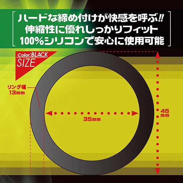 - 仕様パッケージ:11.1×7.6×2.0cm 本体:内径3.5cm リングの厚み13mm!ハード系シリコンでギュッと締め付ける、シンプルなブラックコックリング。