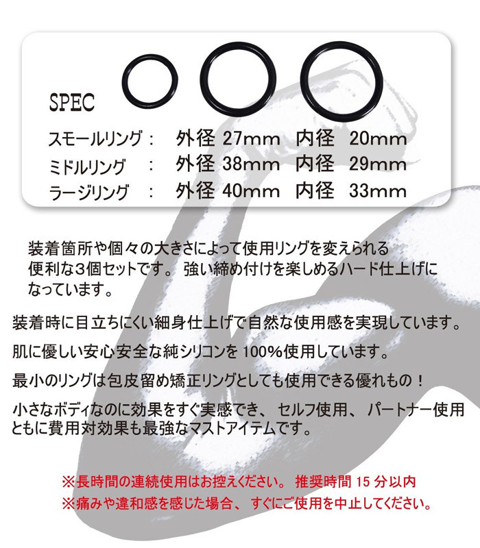 - 仕様パッケージ:13.7×10.6×1.5cm 本体:大4.0cm(内径3.3cm)・中3.8cm(内径2.9cm)・小2.7cm(内径2.0cm) 3種類のリング入り!勃起力・持続力・矯正効果が期待できる男のためのシリコン製パワーリング(ホワイト)。