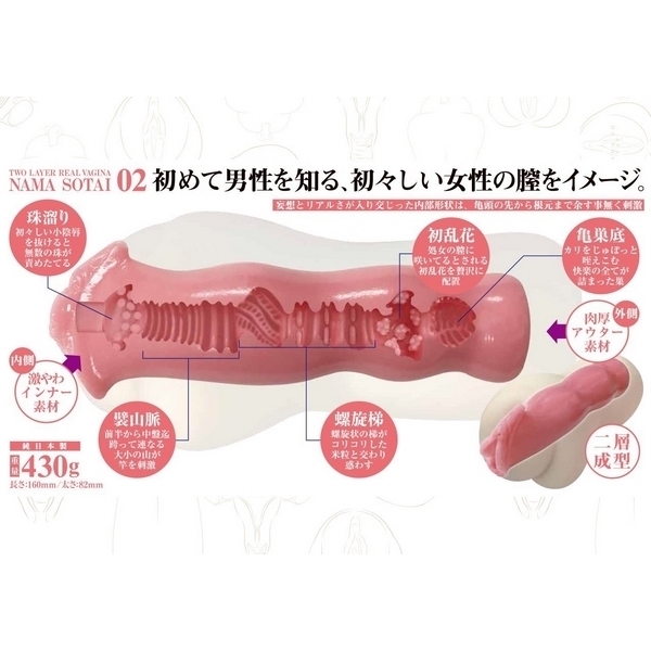 - 仕様パッケージ:22.7×16.2×8.2cm 本体:16.0×8.2cm 重量:430g 生素体(02)は見た目から質感、挿れ心地まで本物を忠実に再現した非貫通型オナホールです。