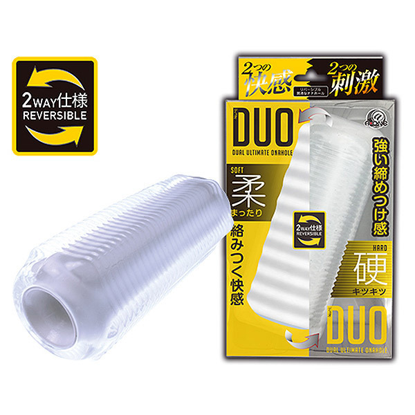 - 仕様貫通型 パッケージ:20.0×11.0×6.0cm 本体:13.5×4.8〜5.4cm ソフトとハードの刺激をこれ一つで♪ひっくり返して使う両面仕様のリバーシブルオナホール「DUO(デュオ)」。