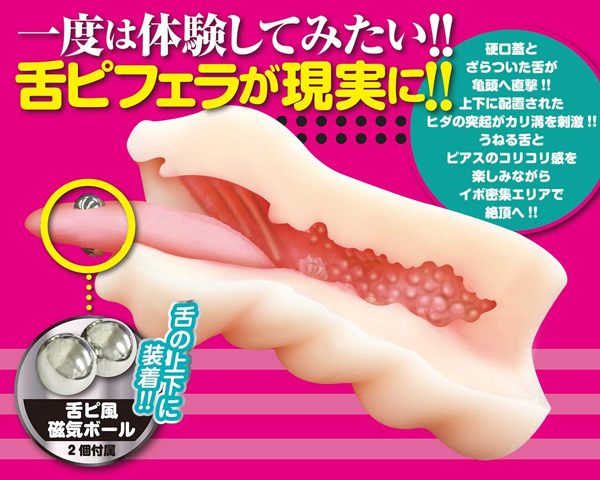 - 仕様パッケージ:19.0×9.0×7.5cm 本体:全長15.0cm・舌長8.5cm 重量:385g 「舌ピフェラビッチ」が夢の舌ピアスフェラを体験できるオナホールとして登場!亀頭をコロコロ擦り上げるひんやりとした舌ピアスや着脱可能な磁気ボールがカリ溝に引っかかり、刺激を与えます♪柔らかな素材で、ハードなホールが苦手な人でも安心!磁気ボールは自由な位置に装着可能で硬口蓋とざらついた舌が亀頭へ直撃し、上下に配置されたヒダの突起がカリ溝を刺激♪うねる舌とピアスのコリコリ感を楽しみながらイボ密集エリアで絶頂へと導きます!まさに舌ピフェラビッチの魅力をたっぷりと味わえる非貫通型フェラホールです。