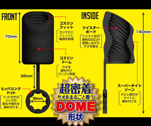 - 仕様パッケージ:19.5×9.5×5.0cm 本体:全長14.0cm・リング内径1.8cm・連結部3.5cm・先端部7.0cm あのコスリングがパワーアップして帰ってきた!手コキ以上の快感×オナホ以上の衝撃が押し寄せる…ッ!新感覚オ〇ニーグッズ第2弾!!睾丸や根元を締め付けるリングはドット付きに進化し早漏防止&勃起力UP!!竿をまるごと覆う超密着なDOME形状が全体を包み込みハードに締め付ける!ツイスト状の凹凸がゴリゴリと責め、内部のクビレ部分が単調ではない刺激を生み出します。