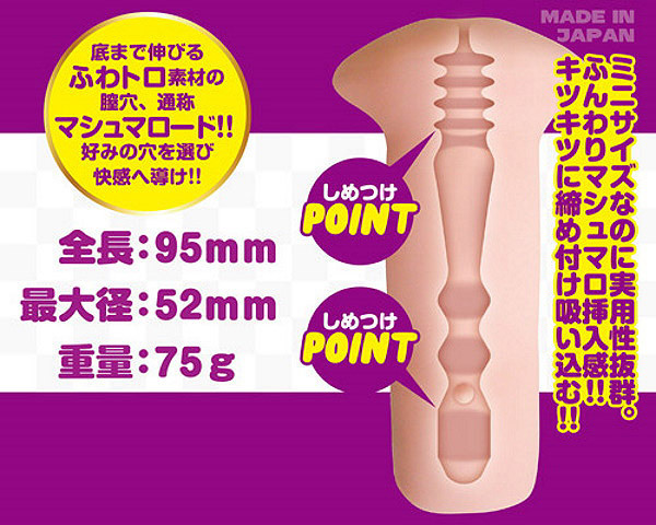 - 仕様非貫通型 パッケージ:9.5×6.4×4.5cm 本体:9.5×5.2cm 重量:75g 刺激系・緩穴系・狭穴系、3つの異なる内部形状を、ふわトロ素材で手軽に楽しめるミニオナホの決定版!底まで伸びるふわトロ素材の膣穴、通称『マシュマロード』射精感抜群な好みの穴を選び快感へ導け!最も狭穴のアユミはキュっと締まった膣道で竿全体を絞り上げて奥まで吸い込み射精を促す!●高品質な純国産●非貫通タイプ●専用ローション付き