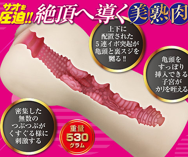 とろけるようなまったり感がサオ全体に絡みつき、上下に施された大きな5連イボ突起で絶頂へと導く♪肉欲に溺れた美熟女と濃密濃厚な時間をこの生膣オナホでぜひ。
