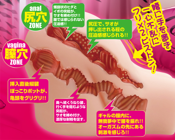 生々しい見た目と挿入感に腰を動かさずにはいられない!螺旋ヒダとイボ突起がギュギュッと締め付ける尻穴&縦横ヒダ続く刺激的な膣穴の2穴仕様♪1800gの大ボリュームサイズで体感するギャルの挑発的内部を思う存分楽しもう!ローション付