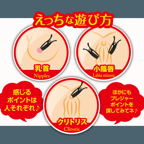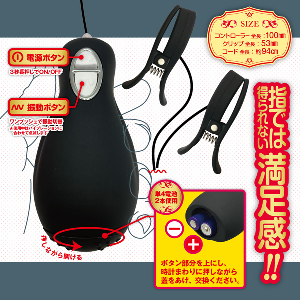 - 仕様パッケージ:22.7×10.5×3.5cm 本体:クリップ全長5.3cm・コントローラー全長10.0cm・コード全長約94cm 電池:単四電池×2本使用 つまむ!悶える!Wの快感!えっちなオトナの必需品♪いつものプレイにプラスするもう1アイテムとしてもオススメ。