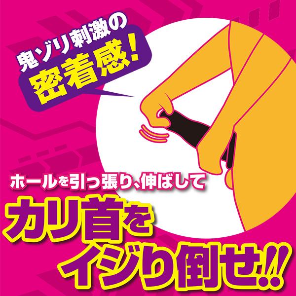 短いストロークでシゴきまくれば、カリ首を強烈に擦り上げる!!本体を伸ばさず手に持ってシコシコすれば通常ホールとして、引っ張って放してをくり返せば亀頭鍛錬グッズとしても使える。