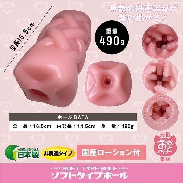- 仕様非貫通型 パッケージ:20.5×13.5×7.5cm 本体:全長16.5cm 重量:490g 無数の段差突起が襲い掛かる!元祖おなぺっと素材を採用!ふわふわ、モチモチ、絡みつきバツグン!柔かい素材で心地いい時間が長く楽しめる!入り口はキュッと締まり、先を進むと段差のある突起が全体をポコポコ乱打!最深部までビッシリと突起が設置させており、ストローク時には入る時も戻る時も刺激がたまらない♪
