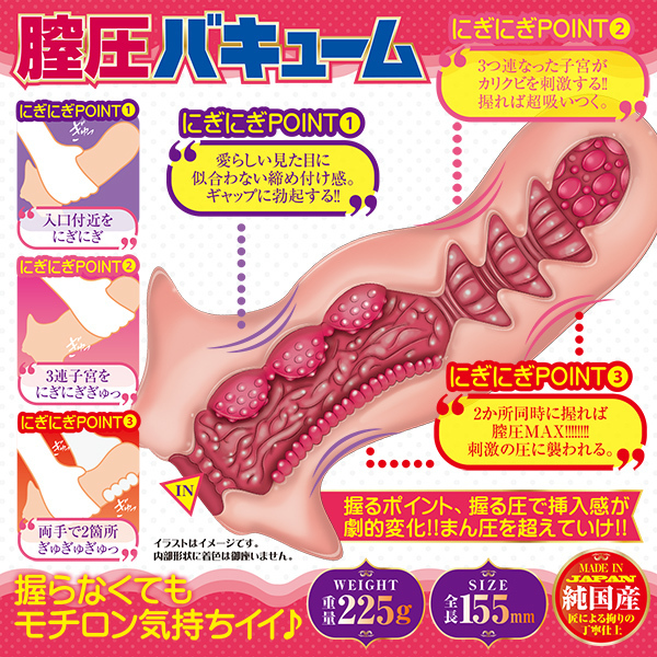 - 仕様非貫通型 パッケージ:17.0×9.0×6.5cm 本体:15.5×5.5×9.5cm 重量:225g 握るポイントや握る圧で挿入感が変化!!にぎにぎ緩めたり締め付けたり圧をコントロールしながら、愉しむオナホール。