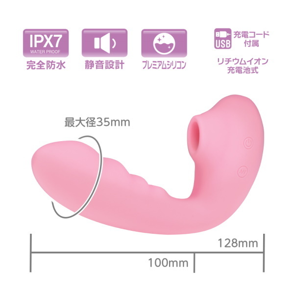 - 仕様パッケージ:18.0×9.0×3.5cm 本体:12.8×3.5cm 重量:120g USB充電式 SNSで話題の<吸うやつ>吸引しながら振動を楽しめるくの字形状に温感機能搭載でリアリティUP!振動部分の形状や太さにもしっかりと拘った納得のアイテムです。