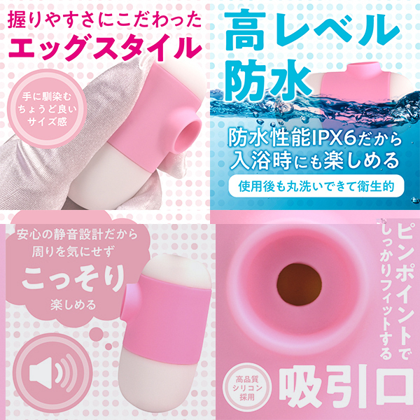 - 仕様パッケージ:ヘッダー10.7×5.5×4.1cm 本体:7.8×直径3.9cm USB充電ケーブル USB充電式 握りやすさにこだわったエッグスタイルの吸引ローターです♪可愛らしいタマゴ型フォルムに、高性能な静音モーターを搭載!上部に配置されたボタンで、片手でも簡単に操作が可能です♪吸引口には柔らかく高品質なシリコン素材を使用し、しっかりとフィットして快適な真空状態を実現!7パターンの吸引アクションを搭載しており、強弱の調整も自由自在です♪120分で満充電でき、最大90分の連続使用が可能!(使用環境により変動します!)さらにIPX6相当の防水設計だから、水洗いもできて清潔に保てます♪手軽さと高性能を兼ね備えた、使いやすさ抜群のアイテムです!