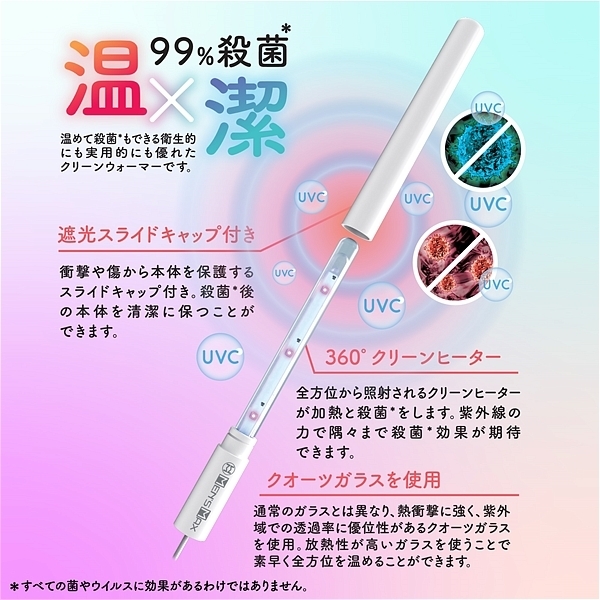 3分で急速加熱、UVランプで360°殺菌、20センチのロングサイズ、乾燥に便利な吸水ソフト、ティック付属、USBケーブル長さ1m。