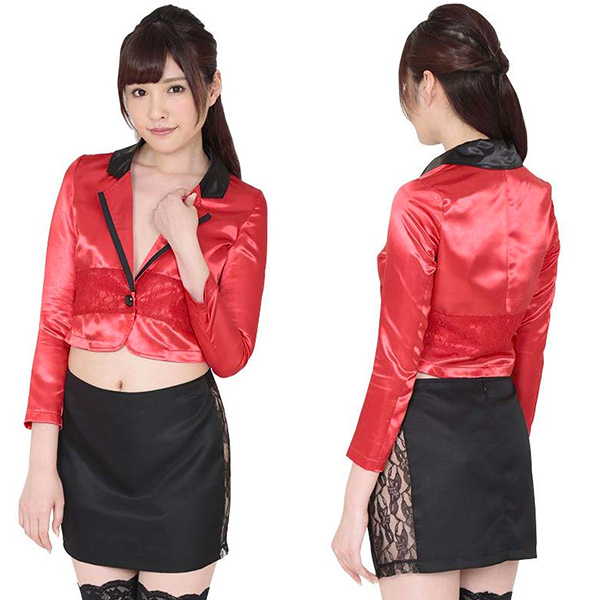 スカートの側面は大胆にもレース素材で肌が見えてしまうセクシーなデザイン!赤のジャケットを素肌に羽織ることで、更にアダルトな魅力を引き出せそうですね♪カジノを彩るディーラー衣装でハロウィンイベントや撮影会にもせひどうぞ!