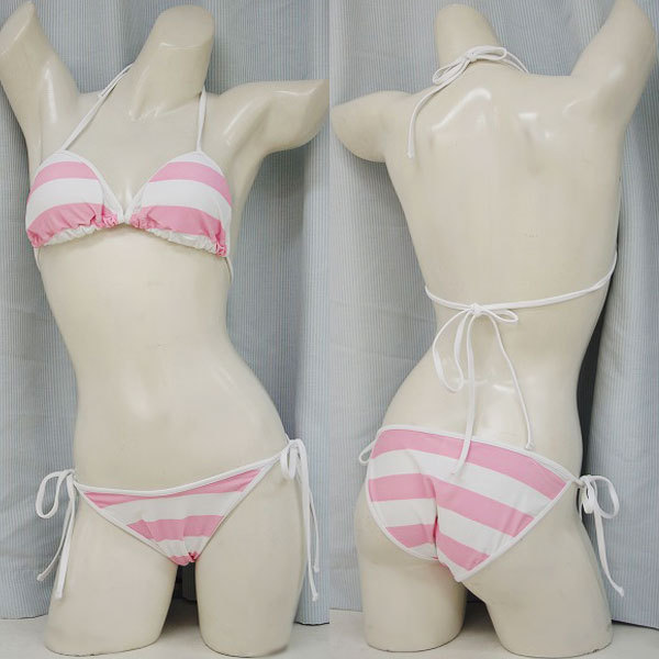 - 仕様フリーサイズ:Bアンダー〜80cm・Bトップ〜100cm・W(ショーツ)60〜76cm 丈:肩紐各50cm(ホルターネック)・ショーツ紐38〜40cm セット内容:ビキニブラ(ブラパット付、パットケースあり)・紐ビキニショーツ パステルカラーで萌え感たっぷり!ピンク×ホワイトのボーダー柄ビキニセットが登場しました。