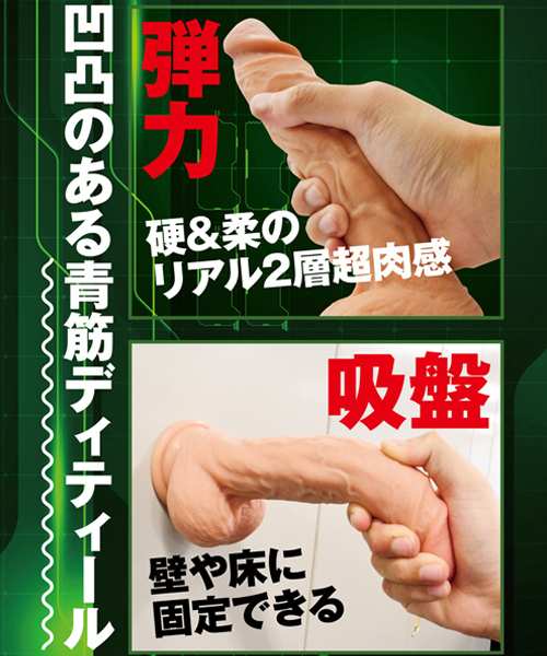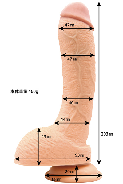 長さ約22cmのロング仕様、太さは挿入し甲斐のある最大4.7cm!内側は筋肉を感じさせる硬い芯入りで、人肌のように柔らかな皮で包んだ二層構造で仕上げています。