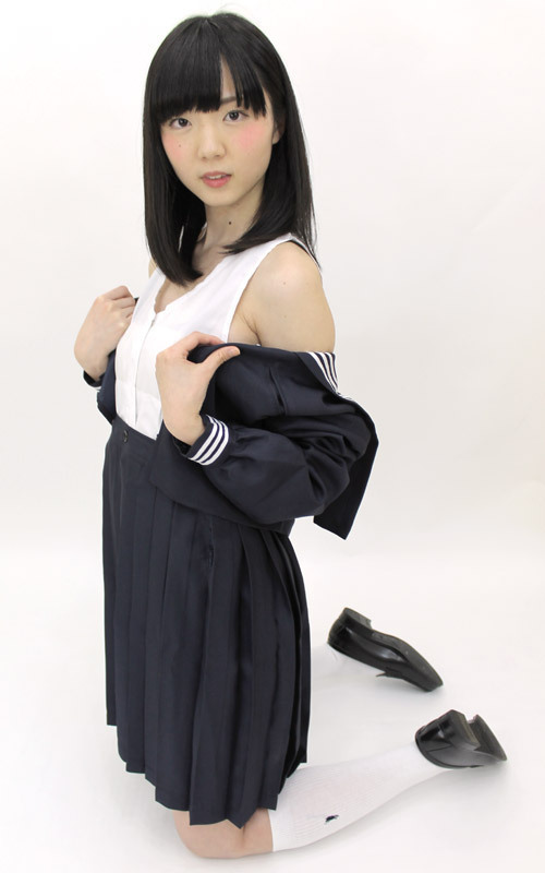 電車でつり革を持っても、お腹が見えません!慎み深いお嬢様学校の制服でよく見かける、白いノースリーブのインナーと無地の紺色プリーツスカートをボタンで繋ぎとめて、セクシー感を押さえたコスチュームです。