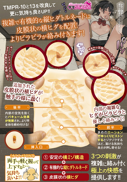 - 仕様非貫通型 パッケージ:21.0×14.5×8.5cm 本体:15.0×8.0×7.0cm 重量:410g タマプレミアム18弾!3種の刺激が複雑に絡みつく410gの非貫通オナホ。