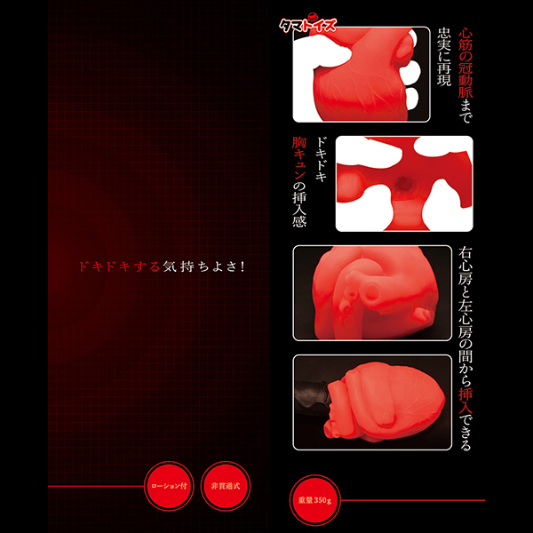 - 仕様非貫通型 パッケージ:19.3×15.0×8.3cm 重量:350g 心臓の形を見事に再現した異世界チックな非貫通オナホ「GRASP HEART」です♪脈打つ血管に右心房、左心房までも再現された見た目はインパクト絶大!心筋の冠動脈まで忠実に再現されていて、ドキドキの胸キュンの挿入感は新鮮味バツグン♪挿入は右心房と左心房の間から入れる形でヒダ系が連続する内部構造に興奮必至!グッと身が縮こまった触感やリアルな造形にドキドキすること間違いなし♪ユニーク性とフェティッシュ系の楽しさをぜひお試しください。
