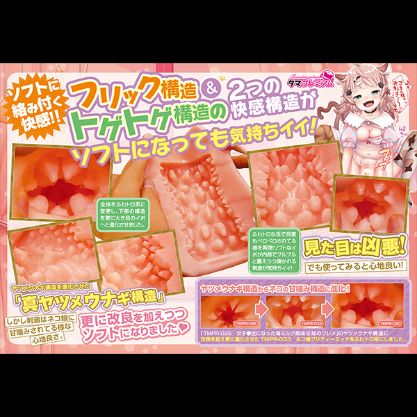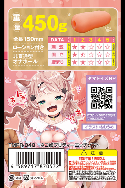 - 仕様非貫通型 パッケージ:14.5×21.0×9.5cm 本体:全長15.0cm 重量:450g 大小山型の突起がさわさわと竿を撫でるゾクゾク感がたまらない!高刺激と思わせながらも心地よい刺激でイカせてくれる非貫通オナホ「ネコ娘プリティーエッチソフト」です♪ネコ娘の甘噛みをコンセプトに開発されたオナホで、タマトイズで人気のヤツメウナギ構造を進化させ、フワトロ系にしたことで大きめのイボのような刺激を実現!アウターはシンプルな筒型で挿入口はポチ穴♪フレキシブルな弾力感のある素材感でサイズ的にミドルサイズ!弾かれるようなフリック構造の内部とびっしり配置された2種類の突起イボが、絡みつくような快感を存分に味わわせてくれます♪●メーカー型番:TMPR-040