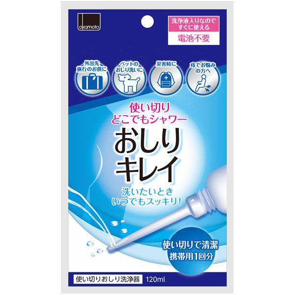 ●大手オカモト社開発の日本製●清潔で安心な使い切りタイプ(携帯用1回分)●水圧自在なソフトボトル採用●無理なく届く8.5cmノズル●国内採取の精製水120ml入りで即使用可。