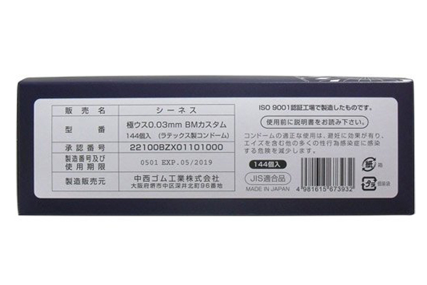 - 仕様メーカー:中西ゴム パッケージ:12.0×24.0×8.0cm 中西ゴムの国産コンドーム「極ウス0.03」144個入り。