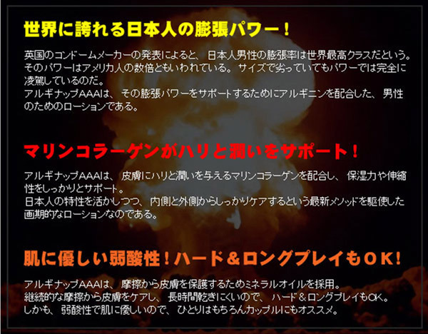 - 仕様ボトル:12.4×4.6×4.6cm 男性用マッサージローション「アルギナップAAA (ノーマル)」マリンコラーゲンも配合した弱酸性なので、肌への負担も少ないです。