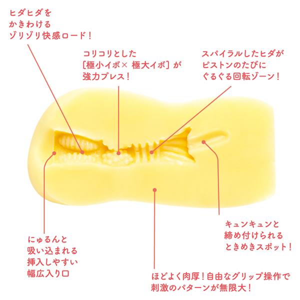 ●ギッチギチに締め付けるハードタイプ●耐久力の高い頑丈なボディ●程よい肉厚感の超硬弾力素材●にゅるんと受け入れる幅広挿入口●ヒダを掻き分けるゾリゾリ快感●イボ付き巨大イボが強力プレス●螺旋ヒダが誘うスパイラルゾーン●最奥スポットでキュンキュン締め付け●パッケージイラスト:島田フミカネ作●使い切りローションと収納袋も付属。