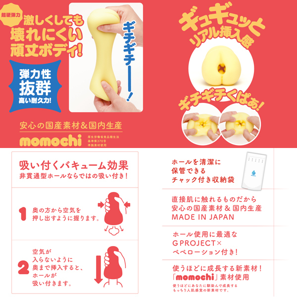 ベタつき&匂いナシの国産素材「momochi」の硬さを変えて、もっと沢山の人に楽しんで貰いたい!そんな想いから生まれたオナホールです。