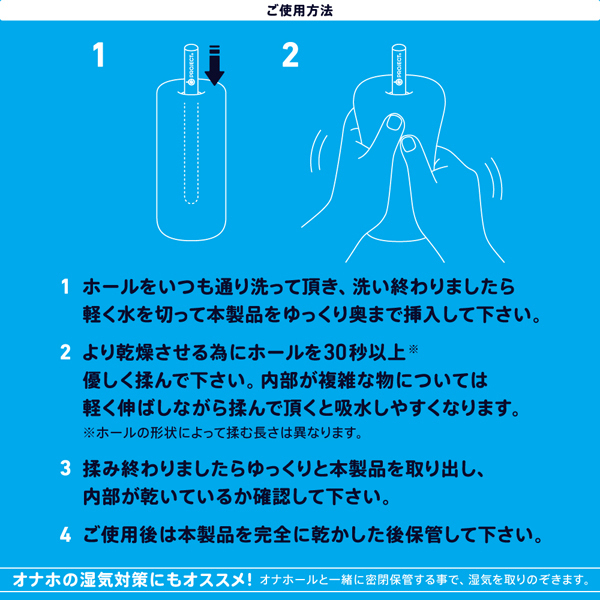 - 仕様パッケージ:5.2×18.5×2.2cm 本体:15.0×1.3cm オナホを洗った後に挿しこんで揉むだけで速乾燥。