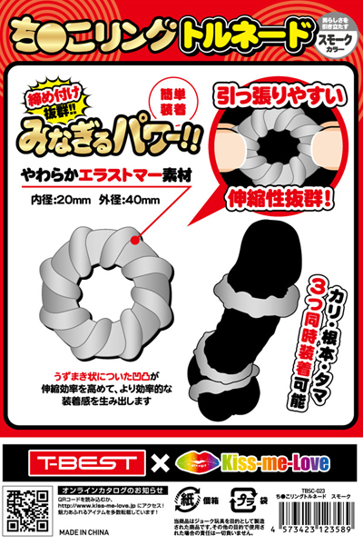 - 仕様パッケージ:17.0×10.8×3.0cm 本体:4.0×1.2cm 重量:21g <T-BEST×KISS-ME-LOVE>夜もがんばリングで大人気のやわらかメンズリング「ち●こリング」が、トルネードになって新登場!今度のち●こリングは「特殊形状3個セット」!トルネードデザインのリングを3つもセットにしました!うずまき状に巻き付いた凹凸が伸縮率を高めてより効率的な装着感を生み出します。