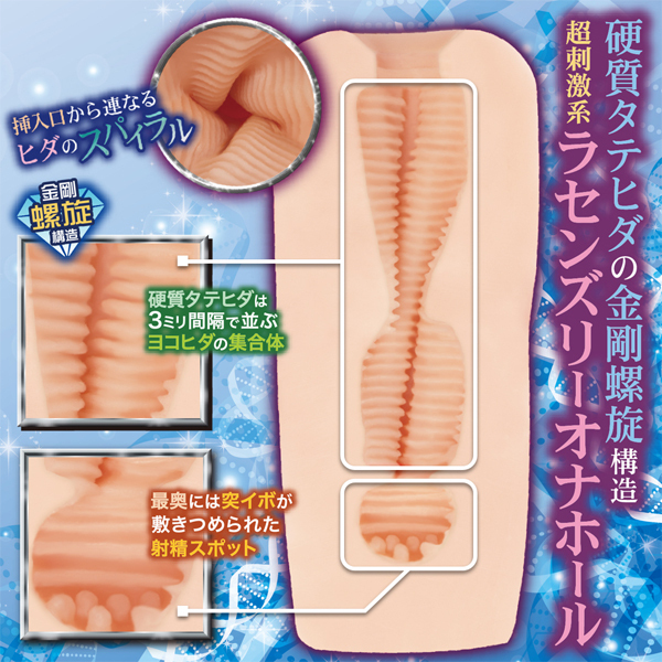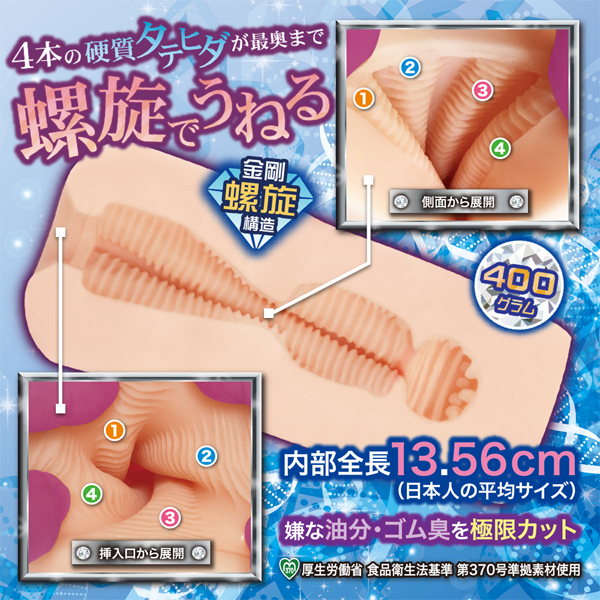- 仕様非貫通型 パッケージ:20.5×12.0×8.0cm 本体:15.0×7.0cm 重量:400g 螺旋でせんずり、それがラセンズリー!ダイヤモンドラセンズリーは、4本の硬質タテヒダが「螺旋でうねる」高刺激スパイラルオナホールです。