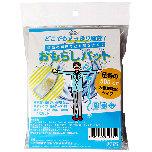 - 仕様パッケージ:20.0×14.0×3.0cm 本体:16.0×13.0×2.5cm 重量:50g これさえあればどこでもスッキリ開放!禁断の願いを実現する「おもらしパット」でいつでもどこでも「おもらし」をすることが出来ちゃいます♪圧巻の500cc大容量吸水タイプ!多い日も安心で、抗菌消臭ポリマーを配合したパットになっているため、プレイ後の後始末も簡単です。