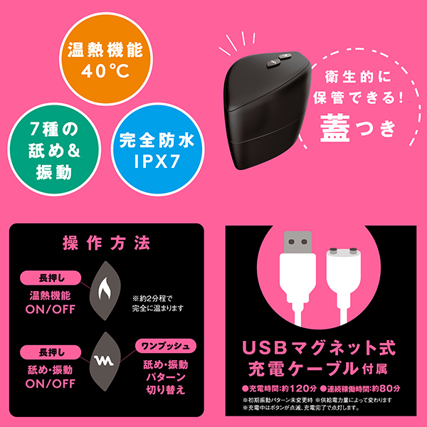- 仕様パッケージ:16.8×12.0×6.0cm 本体:11.0×6.2×9.4cm 重量:202g USB充電式 アツくて甘〜い愛のご奉仕クンニ_超!愛を感じる舐めローター!彼の熱い舌を思い出す温感機能は40℃まで温まる人肌温度_先っぽで刺激するチロチロクンニからグイグイ舐め上げる激しいクンニまで多彩なクンニが楽しめちゃう_さらに7パターンの振動機能付き!震えるあったかベロでとろける濃密前戯_やっぱりクンニがナンバー1!!!完全防水なので使用後のお手入れもラクチン♪敏感な部分に直接使うものだから、優しい肌あたりの高品質ソフトシリコンを使用しました。