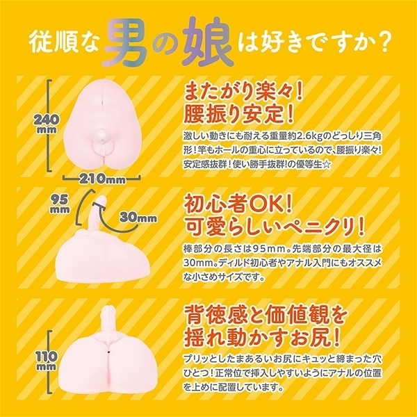 - 仕様非貫通型 パッケージ:30.0×27.7×17.6cm 本体:24.0×21.0×11.0cm 重量:2.6kg 一線を越えますか?背徳感満載の男の娘ボディには「してはいけない感」がいっぱい!どっしり重量約2.6kgの据え置き完全固定型男の娘ホール!激しい動きにも耐えるどっしり三角形!竿もホールの重心に立っているので、腰振り楽々!安定感抜群・使い勝手抜群の優等生!初心者OK!可愛らしいペニクリは棒部分の長さが95mm。