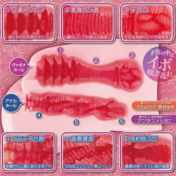 アナルホールは螺旋ベースで構築し、それぞれ異なる個性を持った「疑似粘膜二層構造の2穴」をお楽しみいただけます♪ボディはNOTOWA初の大型タイプで、素材には乙女の太もも感触をイメージした「Mochi肌素材」を使用し!柔らかく滑らかな肌触りにゴム臭も極限までカットしているため、没入プレイを妨げることはありません。