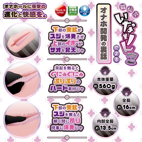- 仕様非貫通型 パッケージ:19.0×11.5×7.5cm 本体:全長16.0cm・内部長13.5cm 重量:560g 狐仙女による新たな刺客が届いた!!それが「スジ爆発!裏なめ子」である。