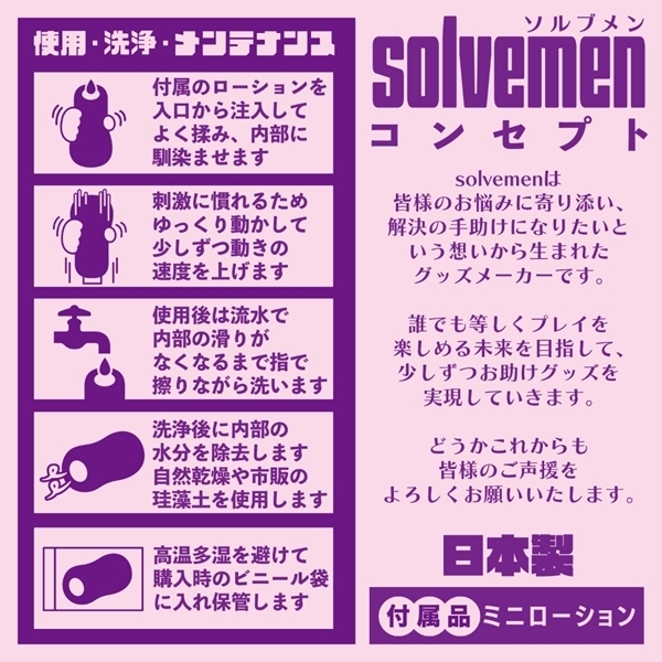 - 仕様非貫通型 パッケージ:18.0×8.0×8.0cm 本体:16.7×6.0cm 重量:365g ソルブメンはあなたのお悩みを解決する存在です。