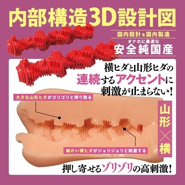 細かいヒダが繊細な刺激を与え、大きなヒダがしっかりと搾り取るような感覚を実現!国内設計・製造で安心の品質を誇り、安定した使い心地を楽しめます。