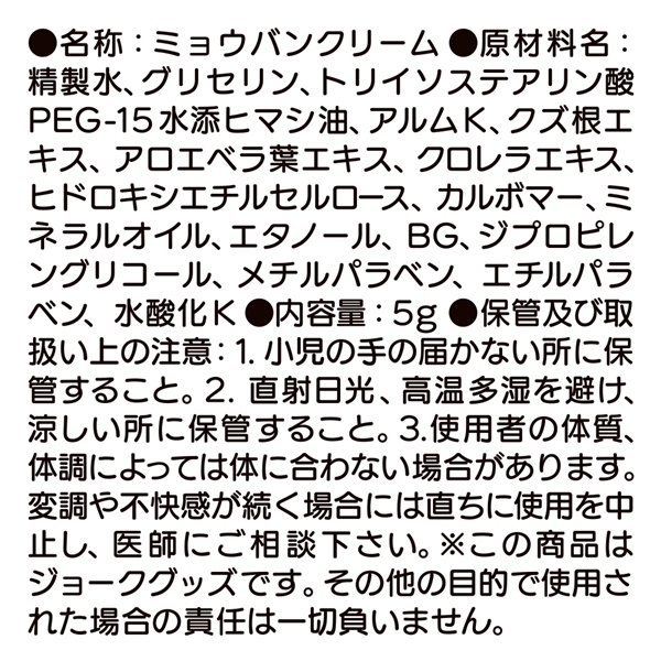 - 仕様パッケージ:14.5×7.0×3.0cm 本体:2.5×3.0×3.0cm 内容量:5ml やさしく塗り込むだけでリラックスをサポートする女性用クリームです♪アロエやハーブ由来の保湿成分を配合し、敏感な部位にもなじみやすい設計になっています!しっとりとした塗り心地で、じんわり広がる感覚が心地よさを演出します♪使用方法は簡単で、適量を手に取り気になる部分にやさしく塗布するだけ!パートナーと一緒に使う際は、必ず相手の同意を得てからご使用ください♪持ち運びに便利な5mlサイズで、旅行や外出時にも活躍します!日本製で成分や製造にもこだわり、安心して使える仕様です♪普段使いのケアや特別なシーンでのサポートとしてもおすすめです!ジョークグッズとしても楽しめる、気軽に使えるアイテムです♪